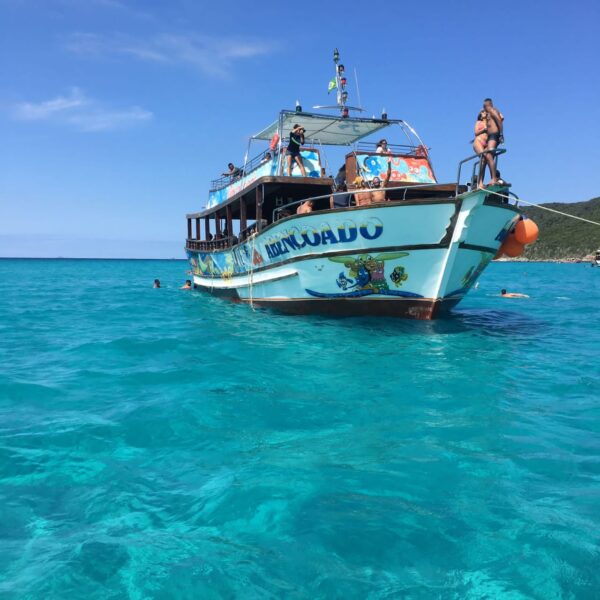 Por ende, puede suceder que podamos o no bajar a la faja de arena. Tendremos una parada de 20min y caso la visita a la playa no sea posible, haremos una parada para tomar baño de mar y aprovechar para nadar cerca de la zona rocosa que alberga mucha vida marina. Si la condición climática lo permite, podremos vivir la increíble sensación de salir a mar abierto. El océano y el cielo juntos en el horizonte sea quizás una de las experiencias más asombrosas. Navegaremos hasta la Gruta Azul, una formación rocosa que se da en solo dos lugares en el mundo. El sol logra reflejar el color del agua el las paredes de la gruta y logra el efecto que la torna azul.