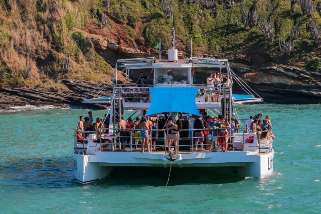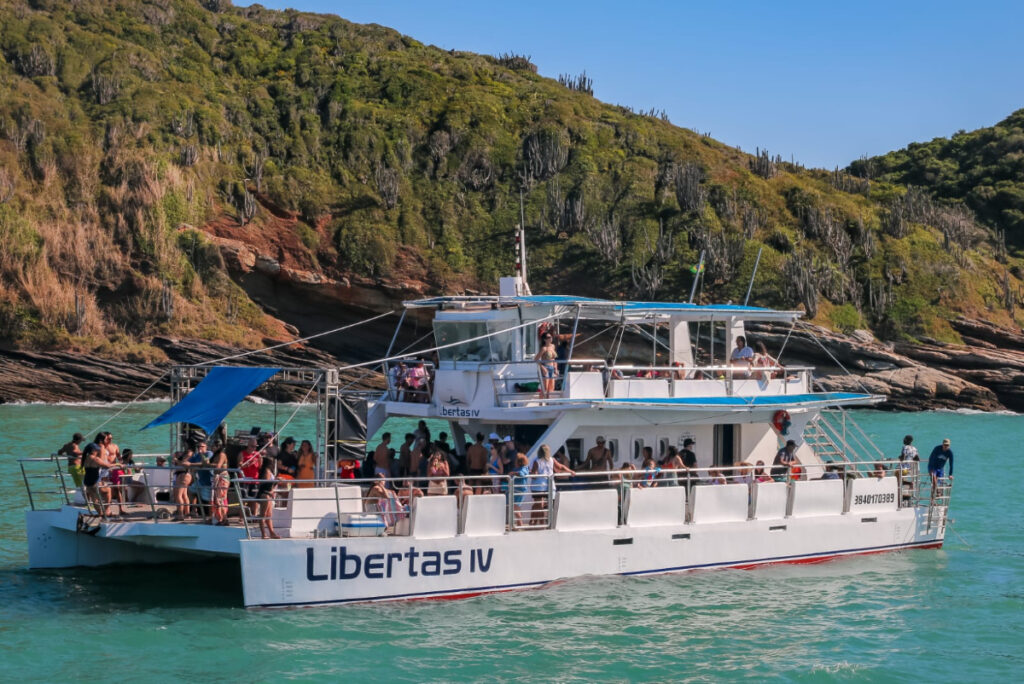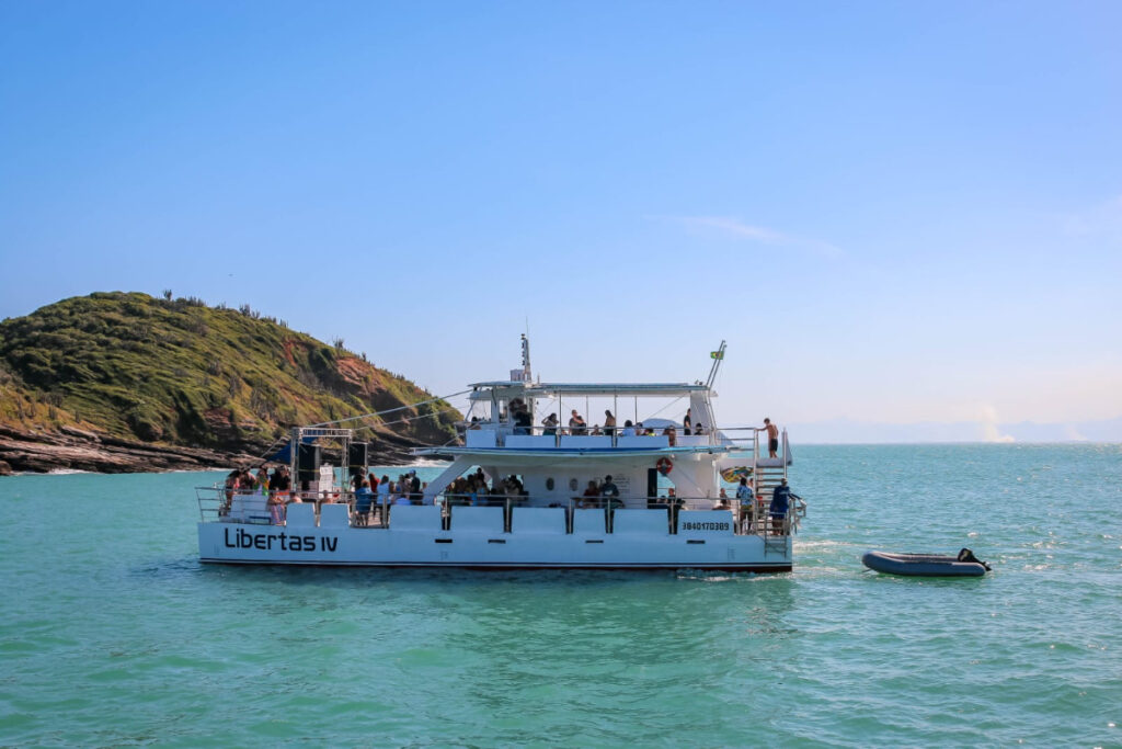 Con capacidad para hasta 220 personas, el catamarán garantiza comodidad y entretenimiento para todos los pasajeros. Embarque en el muelle/puerto de navegación del centro y prepárese para explorar lugares paradisíacos, como las playas de Armação, Ossos, Azeda, Azedinha, João Fernandes, João Fernandinho, entre otras.